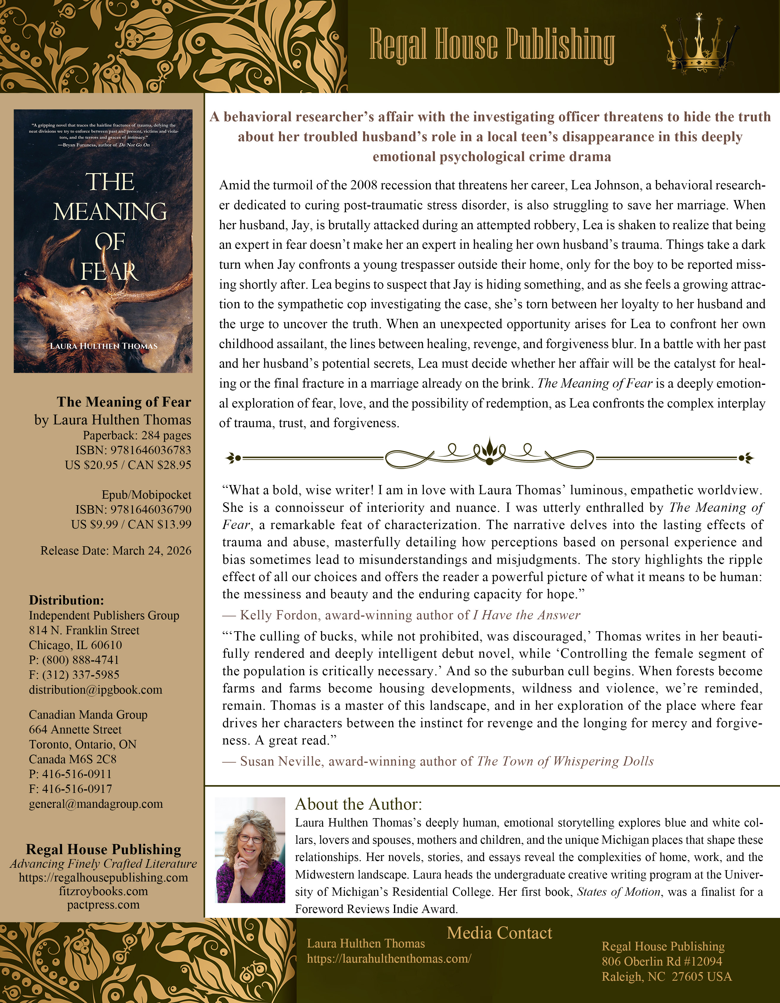 “What a bold, wise writer! I am in love with Laura Thomas’s luminous, empathetic worldview. I was utterly enthralled by The Meaning of Fear, a remarkable feat of characterization.”